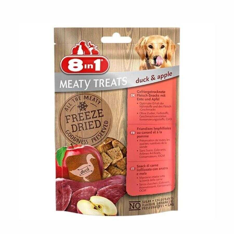 8in1 Meaty Treats Freeze Dried Ördekli ve Elmalı Köpek Ödülü, köpeğinizin bayılacağı enfes bir atıştırmalıktır. Gerçek ördek eti ve doğal elma parçalarının özenle bir araya getirildiği bu ürün, dondurarak kurutma yöntemiyle hazırlanır. Bu yöntem, etin ve meyvenin doğal lezzetini korur ve katkı maddesi kullanılmadan, sağlıklı bir atıştırmalık sunar.