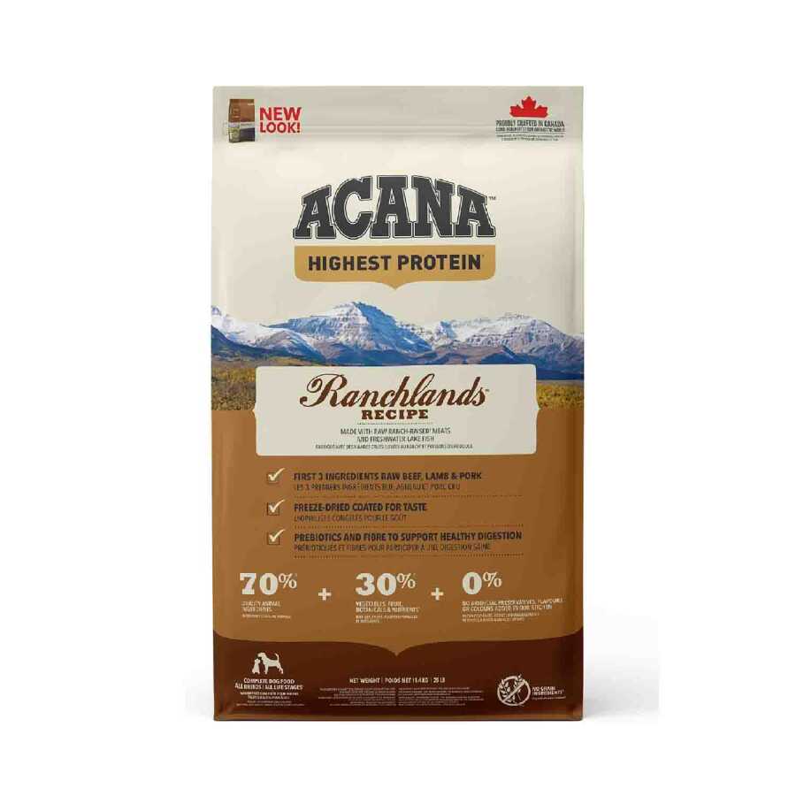 Alberta’nın bereketli çiftliklerinden ilham alan Acana Ranchlands, batı Kanada'nın taze ve yöresel içerikleriyle hazırlanmıştır. Taze Angus sığırı, çayırda beslenen kuzu, Yorkshire domuzu, ova bizonu ve serbest avlanan sudak balığı gibi zengin protein kaynakları içeren bu mama, tüm ırklar ve yaşam evreleri için uygundur. Tahılsız yapısı ve sınırlı karbonhidrat içeriğiyle, köpeğinizin sağlıklı ve dengeli bir yaşam sürmesini destekler.