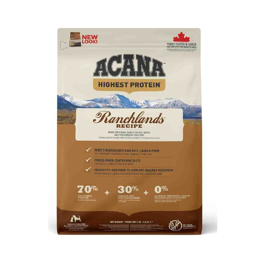 Alberta’nın bereketli çiftliklerinden ilham alınarak geliştirilen Acana Ranchlands, taze Angus sığırı, çayırda beslenen kuzu, Yorkshire domuzu, ova bizonu ve serbest avlanan sudak balığı gibi zengin protein kaynaklarını bir araya getirir. WholePrey™ oranlarıyla hazırlanan bu özel formül, tüm ırklar ve yaşam evreleri için ideal, tahılsız ve dengeli bir beslenme sunar.