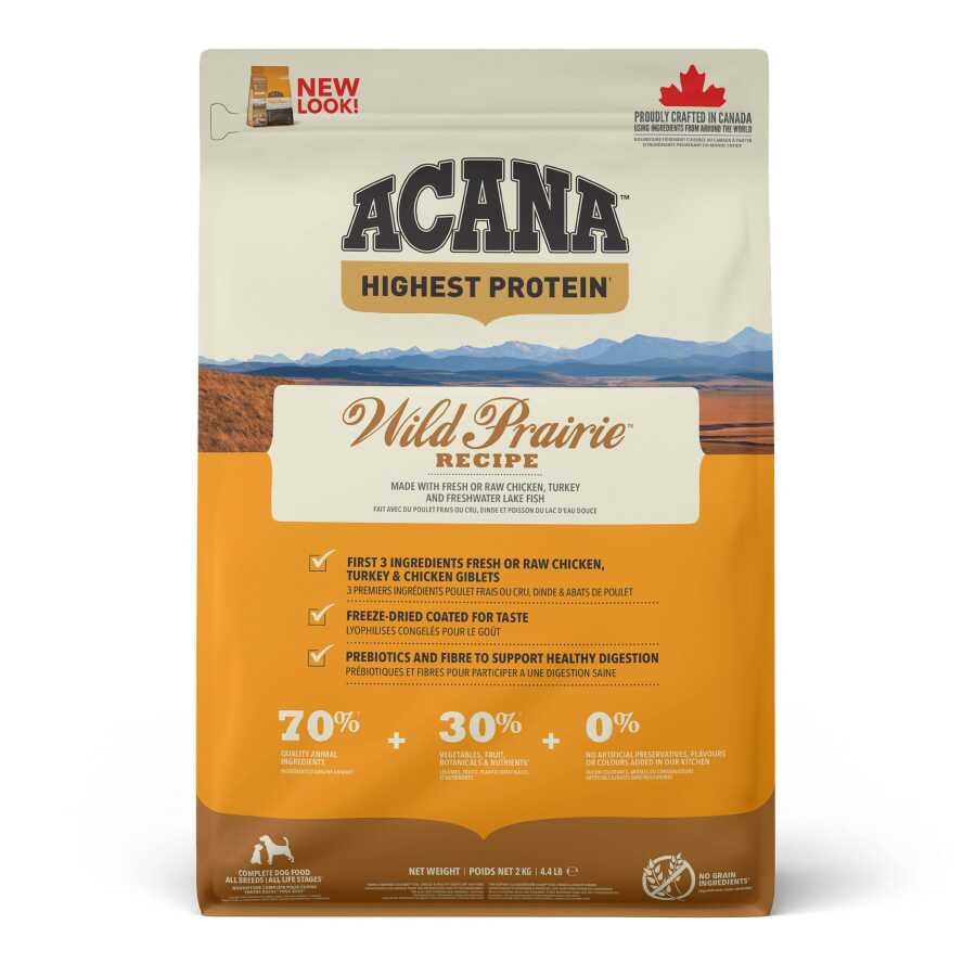 ACANA™ Wild Prairie, yöresel kaynaklardan taze veya çiğ olarak temin edilen serbest dolaşan tavuk, hindi, bütün yumurta ve serbest avlanan balık içerikleriyle doğal ve dengeli bir beslenme sunar. Wholeprey oranlarında hazırlanan bu tarif, katkı maddeleri kullanımını en aza indirerek doğal bir beslenme modeli sağlar. Sınırlı karbonhidrat ve bol hayvansal protein içeriğiyle köpeğinizin kondisyonunu en üst seviyeye taşır.