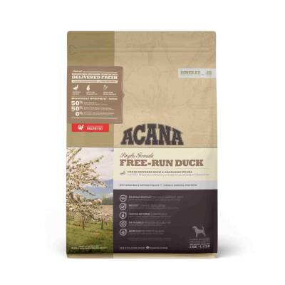 ACANA Free-Run Duck, tek hayvansal protein kaynağı olan %50 ördek içeriğiyle, hassas sindirime sahip tüm ırk ve yaş evresindeki köpekler için ideal bir tahılsız mamadır. Ontario kırsalında serbest dolaşarak yetişen ördeklerden elde edilen et, organlar ve kıkırdak, WholePrey oranlarında sunularak köpeklerin doğal beslenme düzenine uygun bir yapı sağlar. Kabak, balkabağı ve armut gibi taze meyve-sebzelerle sindirimi destekler. Bitkisel protein konsantresi içermez.