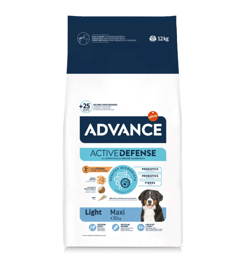 Advance Adult Maxi Light, 15 aydan 6 yaşa kadar olan, 30 kg üzeri büyük ırk yetişkin köpekler için özel olarak geliştirilmiş düşük yağlı bir mamadır. Kilo alma eğilimindeki köpeklerin formda kalmasına yardımcı olan bu mama, yüksek lif ve protein içeriği sayesinde iştah kontrolünü sağlar ve kas kütlesinin korunmasına destek olur. Sağlıklı eklemler ve genel sağlık için gerekli vitamin ve minerallerle zenginleştirilmiştir.