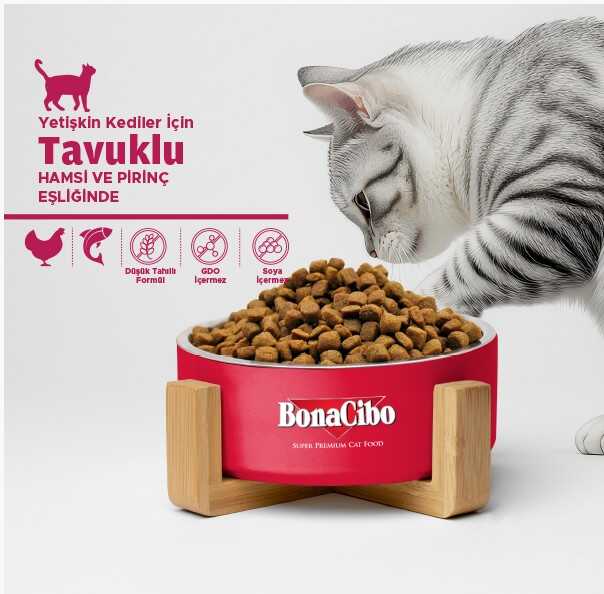 BonaCibo Adult Cat, tüm ırklardan yetişkin kedilerin beslenme ihtiyaçlarına uygun olarak formüle edilmiş, dengeli ve yüksek kaliteli bir kuru mamadır. Protein ve yağ oranı kedinizin metabolizmasına ve ideal kilosunu korumasına destek olacak şekilde ayarlanmıştır. Tahıl oranı düşük, sindirimi kolay içeriğiyle uzun ve sağlıklı bir yaşam için ihtiyaç duyulan tüm besinleri sağlar. Beyaz etin doğal lezzetini sunan bu mama, seçici kediler için de mükemmel bir tercihtir.