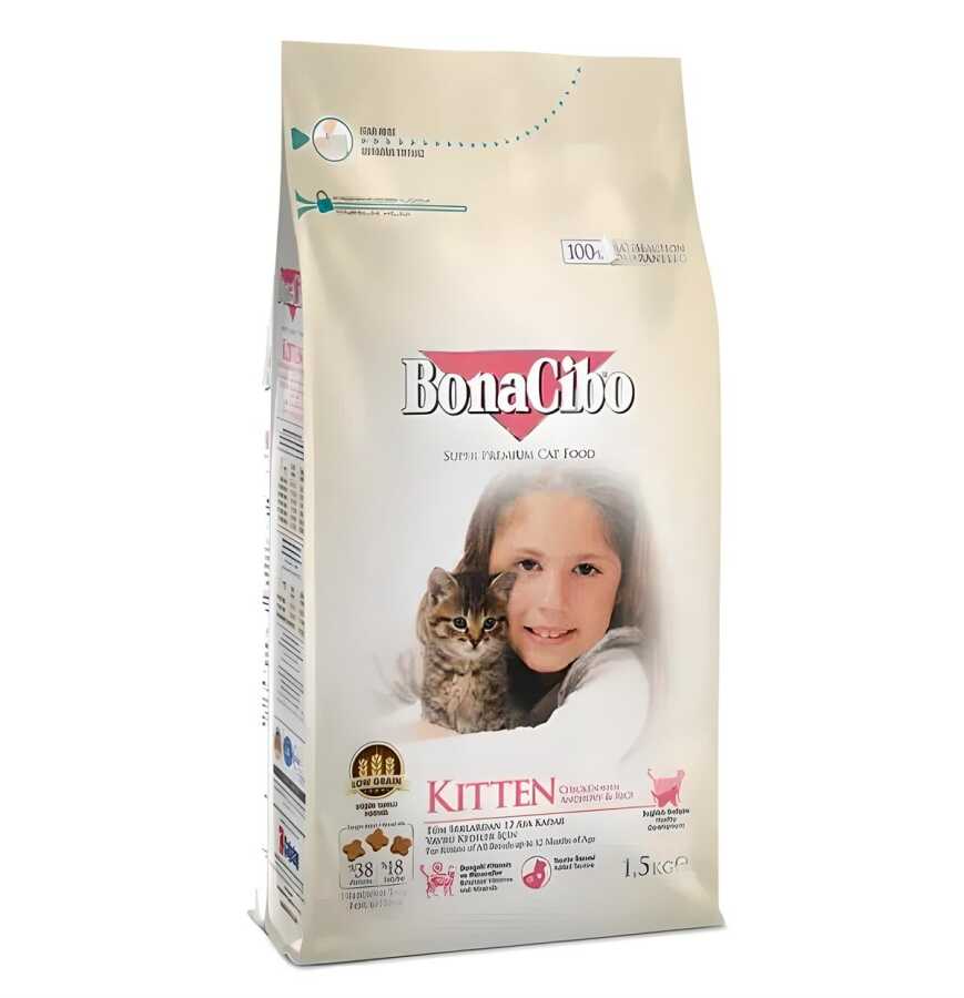BonaCibo Kitten, 12 aya kadar olan tüm ırklardan yavru kediler ile hamilelik ve emzirme dönemindeki anne kedilerin özel beslenme ihtiyaçlarını karşılamak üzere geliştirilmiş eksiksiz bir mamadır. Hassas sindirim sistemine sahip yavru kedilerin sağlıklı gelişimini desteklerken, içerdiği dengeli protein, yağ ve karbonhidrat oranı sayesinde ideal büyümeyi sağlar. Omega-3 yağ asitleri ve temel vitamin-mineraller ile zenginleştirilen formülü, metabolizma ve kemik gelişimini desteklerken bağışıklık sistemini de güçlendirir.