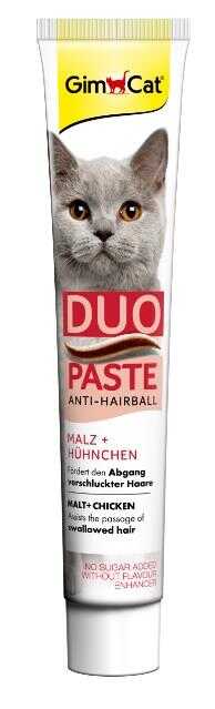 GimCat Anti-Hairball Duo Paste, aromatik malt ve lezzetli tavuk birleşimi ile kedinizin sindirim sistemini destekler. Yutulan tüylerin doğal yollarla dışarı atılmasını kolaylaştıran bu tamamlayıcı mama, kedinize hem lezzetli hem de sağlıklı bir bakım sunar.
