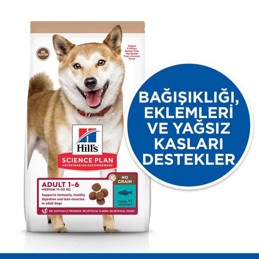 Hill's Science Plan Köpek Yetişkin Orta Tahılsız Tuna, 1 ile 6 yaş arasındaki orta boy köpeklerin ihtiyaçlarını karşılamak için özel olarak geliştirilmiştir. Tahıl içermez ve ayrıca glüten içermez, bu nedenle özellikle gıda intoleransına yatkın köpekler için uygundur. Bu mama, orta düzeyde aktiviteye sahip yetişkin köpeklerin ihtiyaçlarına göre uyarlanmıştır. Sağlıklı ve parlak bir cilde ve tüye katkıda bulunan omega 3 yağ asitleri içeren ton balığı içerir.