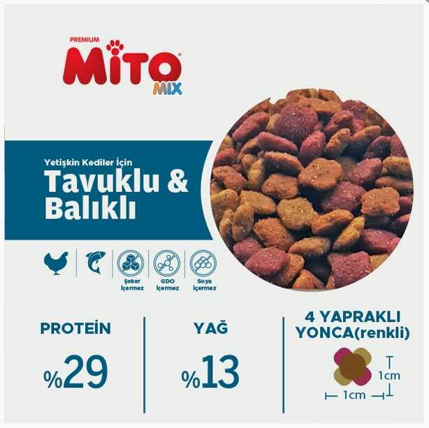 Mito Mix Adult Cat, tüm ırklardan yetişkin kedilerin günlük besin ihtiyaçlarını karşılamak üzere özel olarak formüle edilmiş, dengeli ve lezzetli bir mamadır. Yüksek kaliteli içerikleriyle, kedinizin vücut kondisyonunu korumasına yardımcı olurken, bağışıklık sistemi ve sinir sistemi sağlığını destekler. Taurin ilavesiyle kalp ve göz sağlığını güçlendirirken, özel selüloz içeriği tüy yumaklarının kolayca atılmasına katkı sağlar.