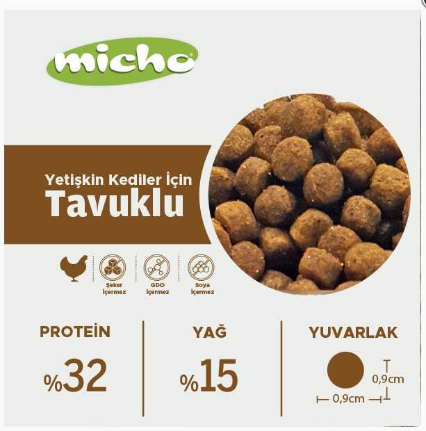 Micho Adult Cat, tavuk, balık ve deniz ürünlerinin eşsiz karışımı ile lezzeti ve besleyiciliği bir araya getirerek yetişkin kediler için ideal bir beslenme sunar. Kedi beslenme uzmanları tarafından geliştirilen bu mama, ekstruder teknolojisi ile hassas pişirme sürecinden geçirilerek üretilmiştir. Bu sayede kedinizin ihtiyaç duyduğu tüm besinleri her öğünde eksiksiz şekilde alması sağlanır. Sindirim ve böbrek sağlığını destekleyen içeriği ile öne çıkar.