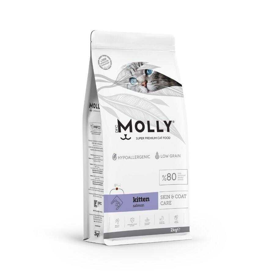Molly Yavru Kedi Maması, 12 aya kadar olan yavru kediler ile hamilelik ve emzirme dönemindeki anne kedilerin ihtiyaçları göz önünde bulundurularak formüle edilmiştir. Somon proteini ile zenginleştirilmiş içeriği, deri ve tüy sağlığını desteklemeye yardımcı olur.