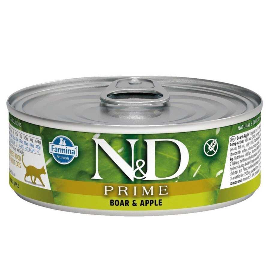 N&D Prime Tahılsız Yaban Domuzlu ve Elmalı Kedi Konservesi, yetişkin kediler için özenle formüle edilmiş tam ve dengeli bir yaş mamadır. Tahılsız yapısıyla hassas kediler için idealdir. Yüksek protein oranı ve özel içerikleriyle bağışıklığı destekler, eklem sağlığını korur ve lezzetiyle kedinizin iştahını kabartır.