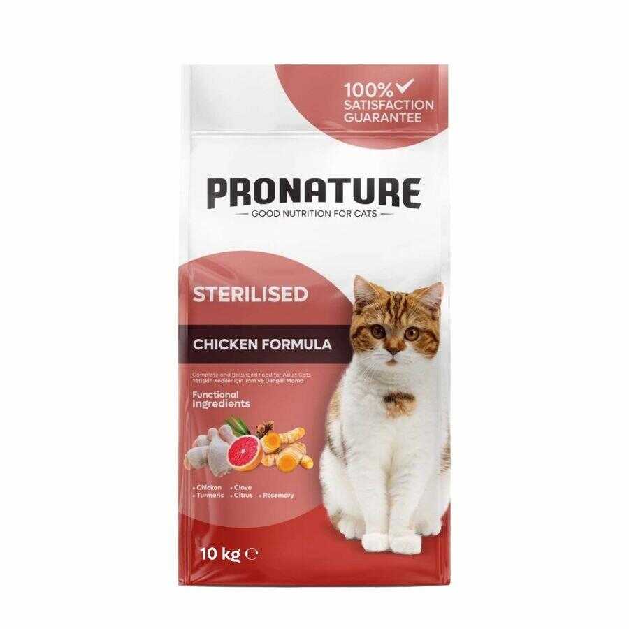 Pronature Kilo Kontrolü İçin Tavuklu ve Pirinçli Kısırlaştırılmış Yetişkin Kedi Maması 10 KG, fazla kilolu kedilerin kilo kontrolünü sağlamak amacıyla özel olarak formüle edilmiştir. Kısırlaştırılmış kedilerin değişen besin ihtiyaçlarına uyum sağlayarak sağlıklı kilo yönetimine destek olur.