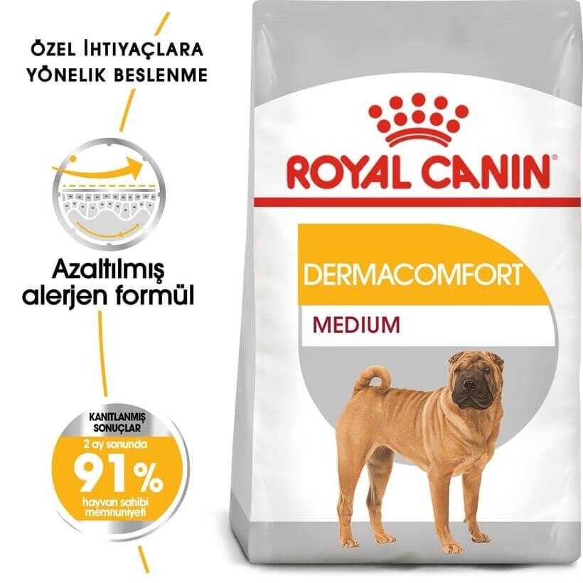 Royal Canin CCN Medium Dermacomfort, orta ırk köpeklerin cilt hassasiyetlerine özel olarak formüle edilmiş 12 kg’lık kuru mamadır. Cildi güçlendirmeye ve dış etkenlere karşı korumaya yardımcı olan omega-3 ve omega-6 yağ asitleri, vitaminler ve antioksidanlar ile zenginleştirilmiştir. Sağlıklı deri yapısını destekleyen özel besin maddeleri sayesinde kaşıntı, tahriş ve tüy dökülmesini azaltmaya yardımcı olur.