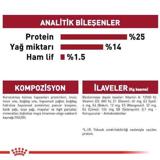 Royal Canin Medium Adult, 11-25 kg arası orta ırk köpeklerin tüm besinsel ihtiyaçlarını karşılamak üzere özel olarak formüle edilmiştir. Sindirilebilirliği yüksek protein içeriği ve dengeli lif oranıyla sindirim sağlığını destekler. Yüksek yağ ve protein oranları sayesinde enerji alımı dengelenir ve ideal kilo korunur. Antioksidanlar, mannan oligosakkaritler ve esansiyel yağ asitleriyle bağışıklık sisteminin güçlenmesine katkıda bulunur. Lezzeti arttırılmış formülüyle iştah açıcıdır.