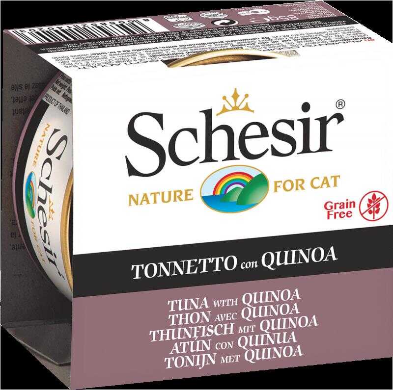 Schesir Jel İçinde Ton Balıklı Kinoalı mama, yetişkin kediler için özel olarak hazırlanmış, %100 doğal içeriklere sahip yüksek kaliteli bir konserve kedi mamasıdır. Fileto edilmiş gerçek ton balığı ve sindirimi kolaylaştıran kinoayla zenginleştirilmiş bu lezzetli tarif, renklendirici, aroma artırıcı ve koruyucu içermez. Elle işlenen doğal malzemeler, buharda pişirilerek maksimum besin değeri korunur. Kedinizin damak tadına uygun, sağlıklı ve lezzetli bir öğündür.