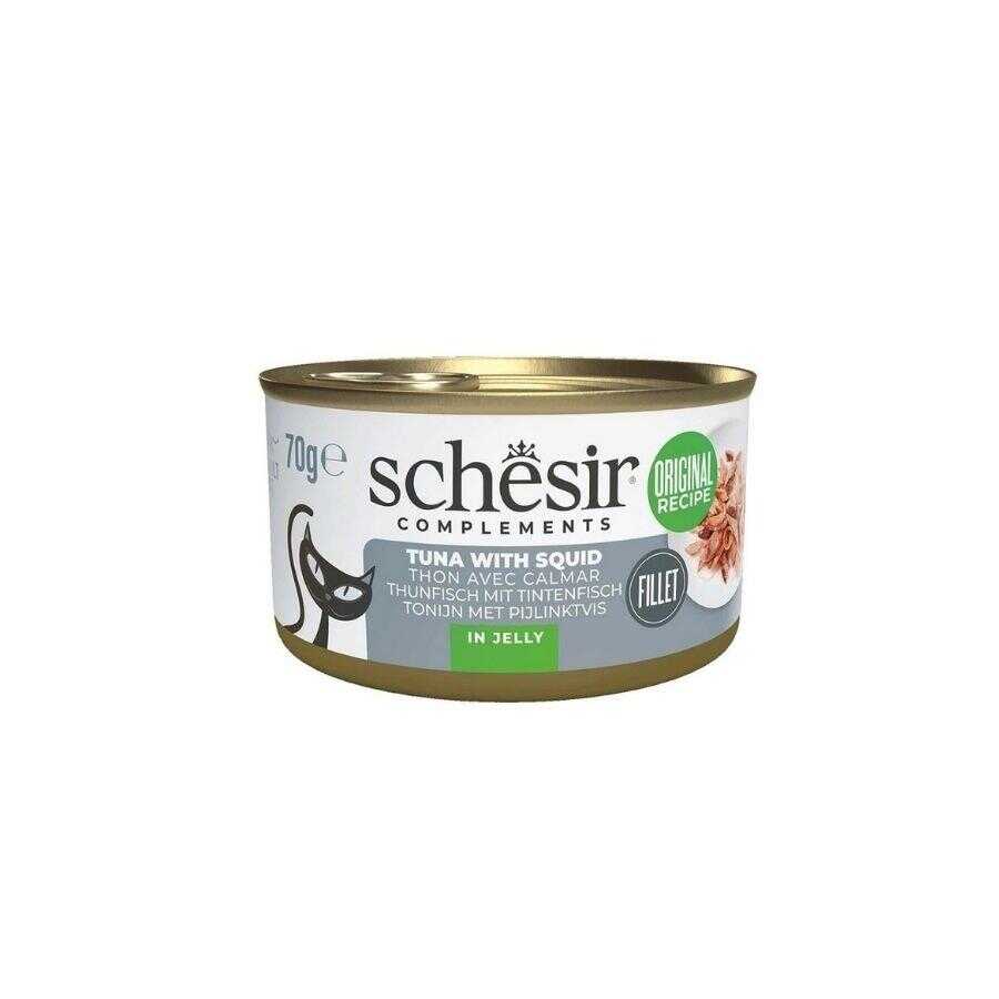 Schesir Ton Balıklı ve Kalamarlı Jöle İçinde Kedi Konservesi, katkısız içeriği ve deniz lezzetiyle kedinizin günlük beslenmesine hem sağlık hem de lezzet katar.
