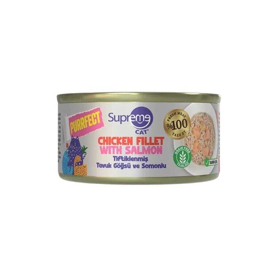 Supreme Cat Purrfect Tiftiklenmiş Tavuk Göğsü ve Somonlu Konserve Kedi Maması, kedinizin günlük beslenmesini desteklemek için özenle hazırlanan premium bir formüldür. %100 taze etten üretilen tahılsız yapısı, tavuk ve somonun lezzetli birleşimi ile yüksek protein ve taurin desteği sağlayarak kedinizin gelişimine katkıda bulunur.