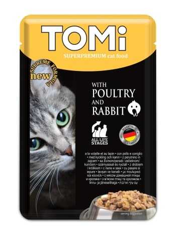 Tomi Kedi Kümes Hayvanı & Tavşan Pouch Mama, yetişkin kedilerin günlük besin ihtiyacını karşılamak üzere dengelenmiş tam bir mamadır. Lezzetli kümes hayvanı ve tavşan etinin harmanlanmasıyla hazırlanan bu yaş mama, kedinizin iştahla tüketeceği bir öğün sunar. Dengeli protein ve yağ oranları ile sağlıklı bir yaşamı destekler.