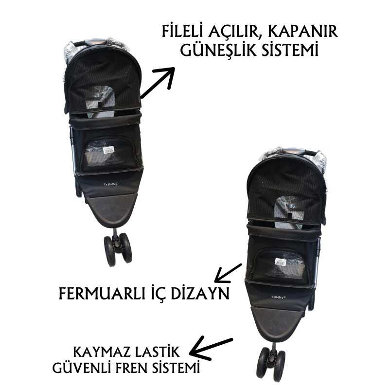 Tommy Evcil Hayvan Arabası 80 x 46 x 99 cm Siyah, küçük ırk köpekler ve kediler için konforlu ve güvenli bir taşıma deneyimi sunar. Hafif yapısı ve tek elle katlanabilir tasarımı sayesinde günlük kullanımda büyük kolaylık sağlar. Sağlam çelik iskeleti ve 400D Oxford kumaşıyla dayanıklı, şık ve uzun ömürlü bir üründür. Farklı zeminlerde rahat hareket imkânı sunan dolgu tekerleklerle donatılmıştır.