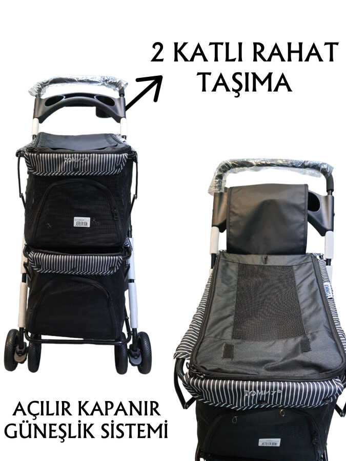 Tommy İki Katlı Evcil Hayvan Arabası, aynı anda iki farklı evcil hayvanı taşımak isteyenler için özel olarak tasarlanmıştır. Şık siyah tasarımı, sağlam çelik iskeleti ve dayanıklı 400D Oxford kumaşıyla güvenli ve konforlu bir taşıma deneyimi sunar. İki ayrı bölmesi sayesinde kedilerin veya küçük köpeklerin ayrı alanlarda rahatça seyahat etmesini sağlar. Alt kısımda bulunan geniş yük sepeti ise eşyalarınızı taşımanız için ekstra alan sunar.