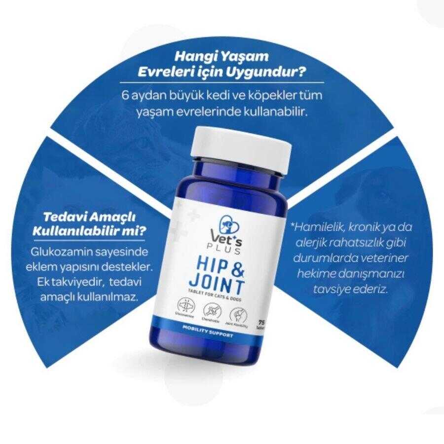 Vet's Plus Hip&Joint Eklem Yapısı Destekleyici Glukozamin Tablet, kedi ve köpeklerin hareket kabiliyetini artırmak ve eklem sağlığını korumak için özel olarak formüle edilmiştir. İçeriğindeki güçlü bileşenler sayesinde kıkırdak yapısını desteklerken dostlarınızın çok daha konforlu hareket etmesine yardımcı olur.