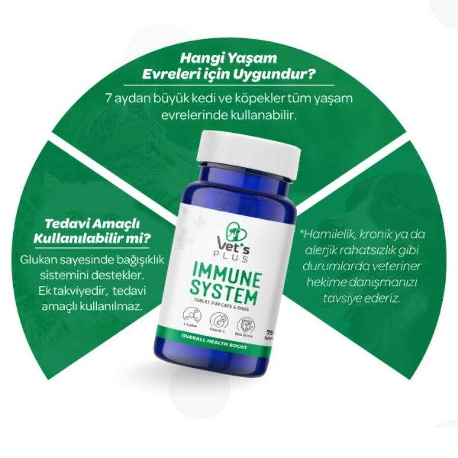Vet's Plus Immune System Bağışıklık Sistemi Güçlendirici Tablet, kedi ve köpeklerin savunma mekanizmalarını en üst seviyeye çıkarmak için Beta Glukan ve Ekinezya ile zenginleştirilmiş bir takviyedir. Hastalıklara karşı direnç oluşturmaya yardımcı olan bu tablet, içeriğindeki bitkisel özler ve vitaminler sayesinde dostlarınızın çok daha zinde kalmasını sağlar.