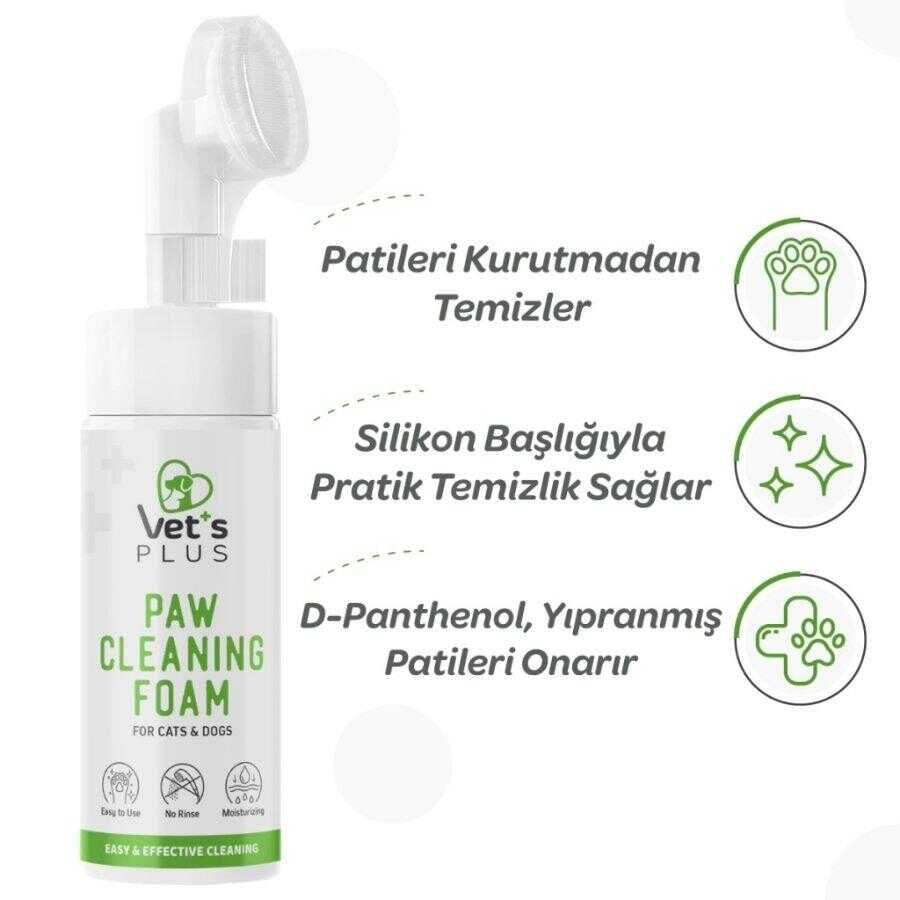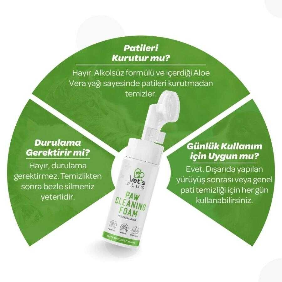 Vet's Plus Aloe Vera Özlü Pati Temizleme Köpüğü, dışarıda yapılan günlük yürüyüşlerin ardından kedi ve köpeklerinizin pati temizliğini hızlı ve etkili bir şekilde yapmanız için geliştirilmiştir. Alkol içermeyen nazik formülü ve özel silikon fırça başlığı sayesinde, patilerdeki kirleri cildi kurutmadan arındırır.