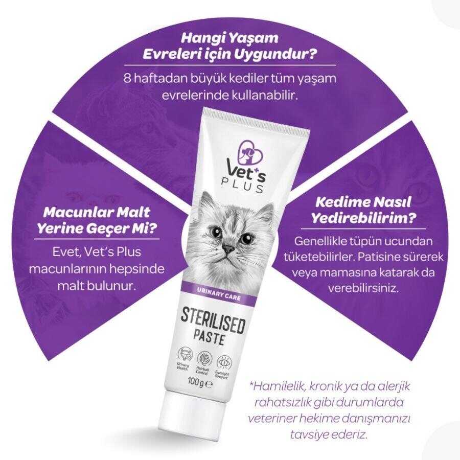 Vet's Plus Kısırlaştırılmış Kediler İçin Malt Kedi Macunu, kısırlaştırma sonrası değişen metabolik ihtiyaçları desteklemek için özel olarak geliştirilmiştir. İçeriğindeki kızılcık özütü ve DL-Metionin sayesinde idrar yolu sağlığını korumaya yardımcı olurken, yüksek kaliteli malt özleri ile tüy yumaklarının doğal yollarla atılmasını sağlar.