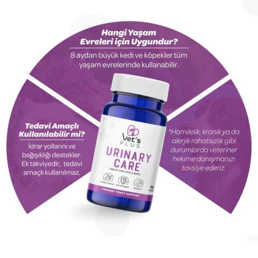 Vet's Plus Urinary Care İdrar Yolları Destekleyici Tablet, kedi ve köpeklerin boşaltım sistemi sağlığını korumak amacıyla özel olarak formüle edilmiştir. İçeriğindeki kızılcık özütü ve vitamin desteği sayesinde idrar yollarında oluşabilecek hassasiyetlere karşı doğal bir koruma sağlamaya yardımcı olur.