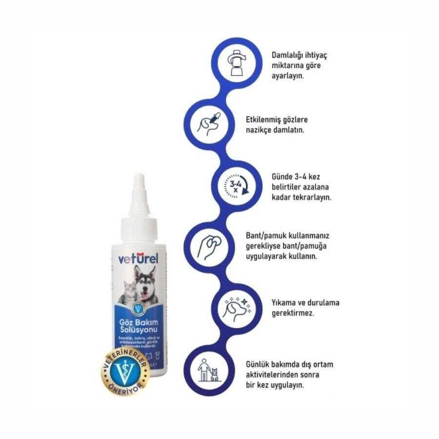 Veturel Kedi, Köpek ve Diğer Hayvanlar İçin Göz Bakım Solüsyonu, her yaştaki tüm hayvanlarda güvenle kullanılabilen doğal bir bakım ürünüdür. Yeni doğan ve hamile hayvanlarda dahi zararsız formülü sayesinde güvenle uygulanabilir. Nötr pH değeri ile göz ve çevresindeki kaşıntı, tahriş ve kızarıklıklara karşı doğal bir çözüm sunar. Alerjenleri etkisiz hale getirerek gözlerdeki rahatsızlıkları azaltır, gözyaşı lekelerine karşı hijyenik bir çözüm sağlar. Veteriner hekimler tarafından önerilen bu ürün, antibiyotik, alkol, iyot ve kortizon içermez, sağlıklı dokulara zarar vermez. Çevre dostu yaklaşımıyla "reduce, reuse, recycle" prensiplerini benimser.