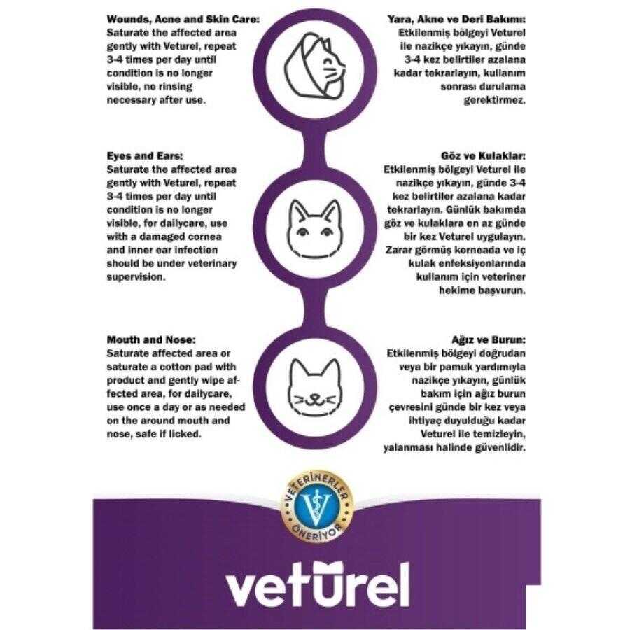 Veturel Kediler İçin Yüz Bakım Solüsyonu, her yaş ve cinsten kediler için güvenli ve etkili bir yüz bakım ürünüdür. Göz, kulak, ağız çevresi ve cilt bakımında kullanılabilir. Doğal formülü sayesinde kedi aknesi, gözyaşı lekeleri, yara ve tahrişlerin giderilmesine yardımcı olurken, enfeksiyonlara karşı koruma sağlar. Hamile ve yavru kedilerde güvenle kullanılabilir, durulama gerektirmez ve yutulması halinde güvenlidir.